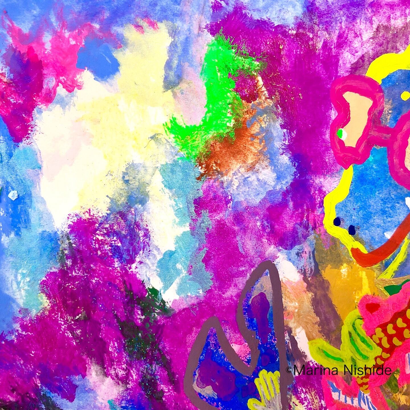 「ココからの可能性の扉シリーズ」という作品の上に、動物たちが浮きでて見えてきたので、それをなぞり描いた作品シリーズです。